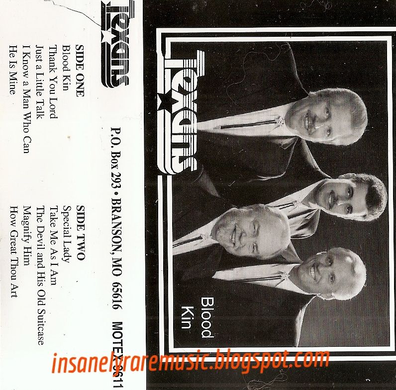 Here is my second post from "The Texans". Like I stated in the previous post, the band began in 1971 as The Masters' Four; a full time traveling quartet. In 1983, they moved to Branson, MO and became known as The Texans. The artwork shows a Branson, Mo. address for the band, so this must be from 1983 or later, but I'm not sure exactly when. Since the catalog # for this release is MOTEX 9611 and the last tape from them I posted was # MOTEX 9612, I assume this is older than the tape in the last post. I also know that this was a TAPE ONLY release and never made it to cd. They are still performing today, although the line-up is different and many members have come and gone over the years. They have done shows with Christian heavyweights including Cecil Todd, TD Jakes, Jesse Duplantis, Jerry Falwell, Tim Lahaye, and many more.